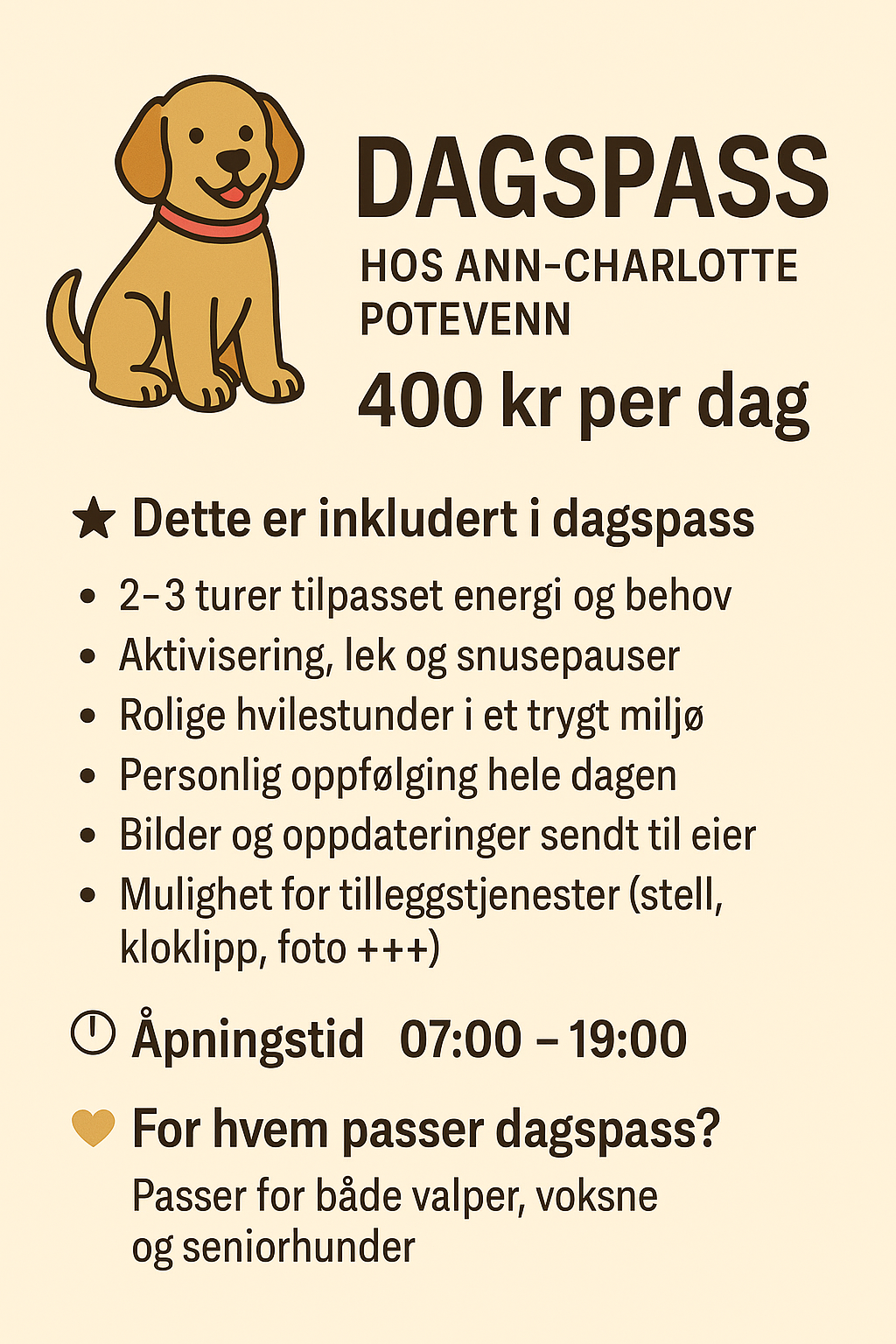 Ved å booke tur eller stell hos meg, samtykker du til at jeg kan bruke bilder av hunden din i sosiale medier og markedsføring – men du kan selvfølgelig si nei når som helst. Ingen adresser, navn eller sensitiv informasjon publiseres, og alle bilder tas med respekt og varme.