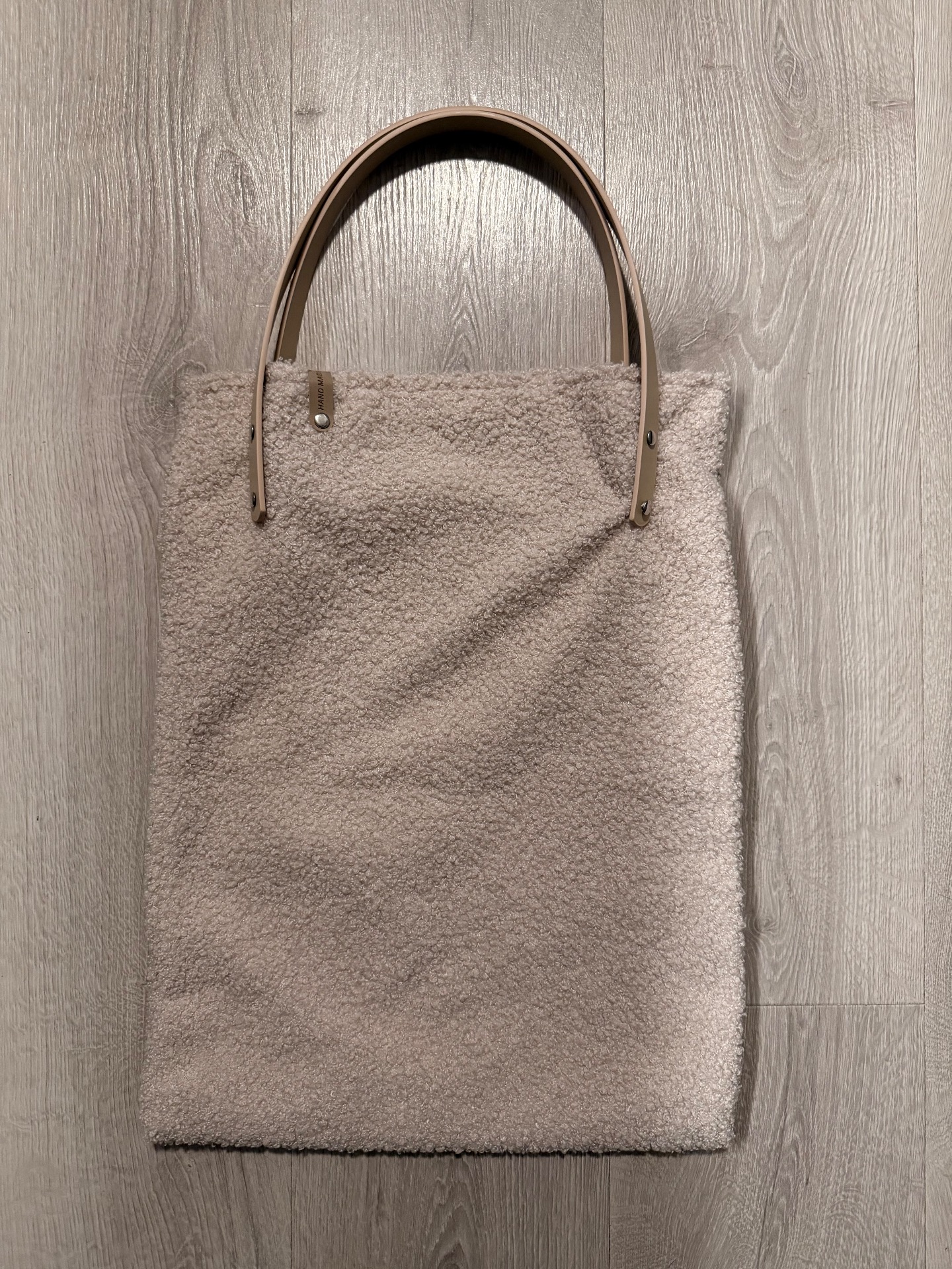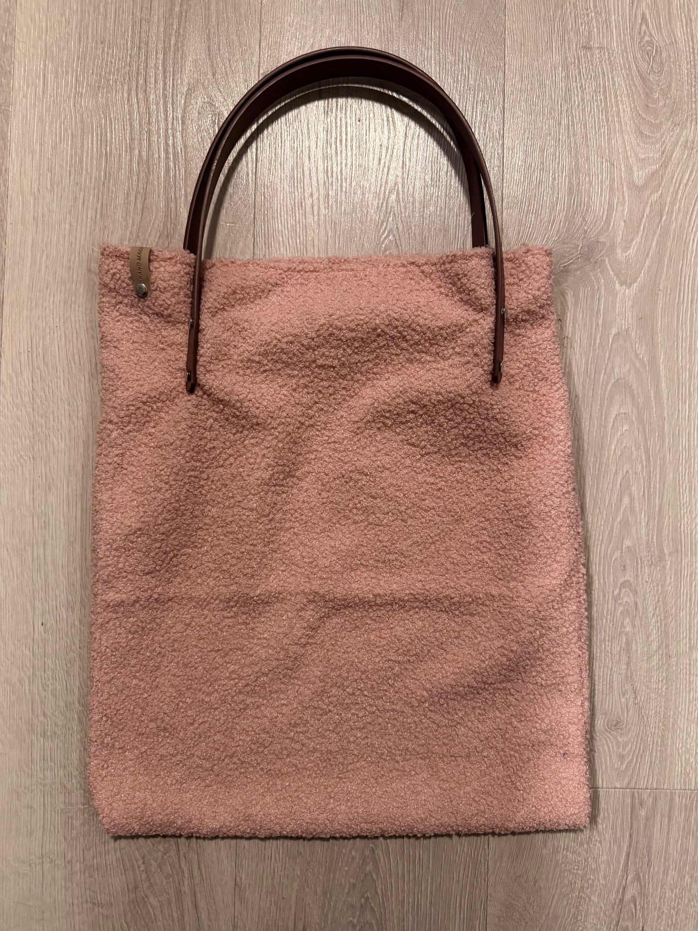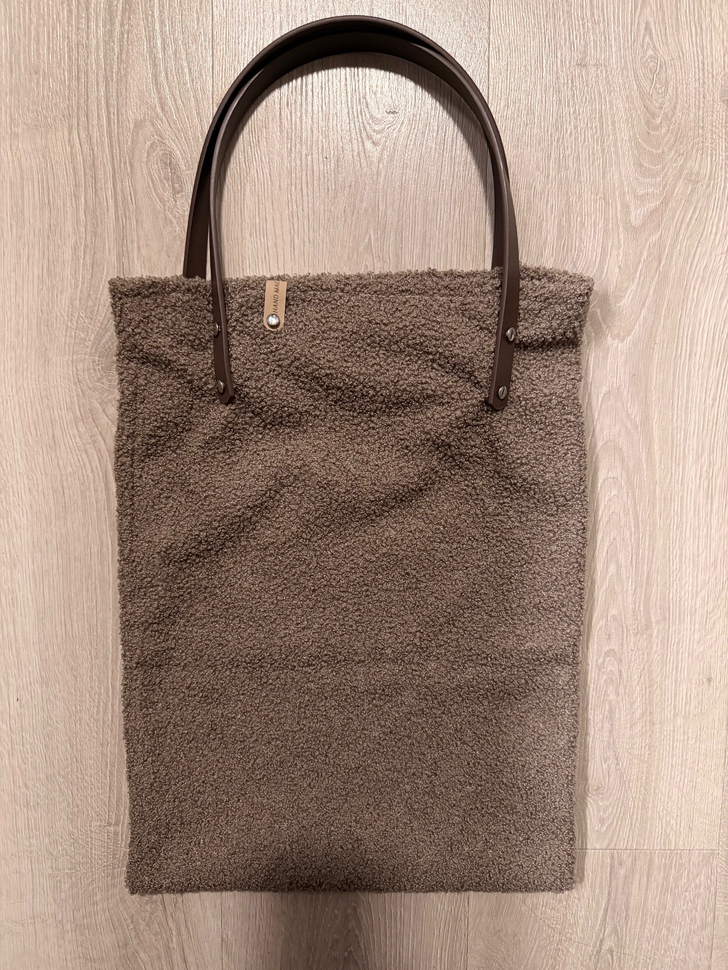 Denne håndlagde tote-bagen er laget i deilig, mykt teddystoff og utstyrt med solid håndlagde skinnreimer – en veske som både føles luksuriøs og ser fantastisk ut.