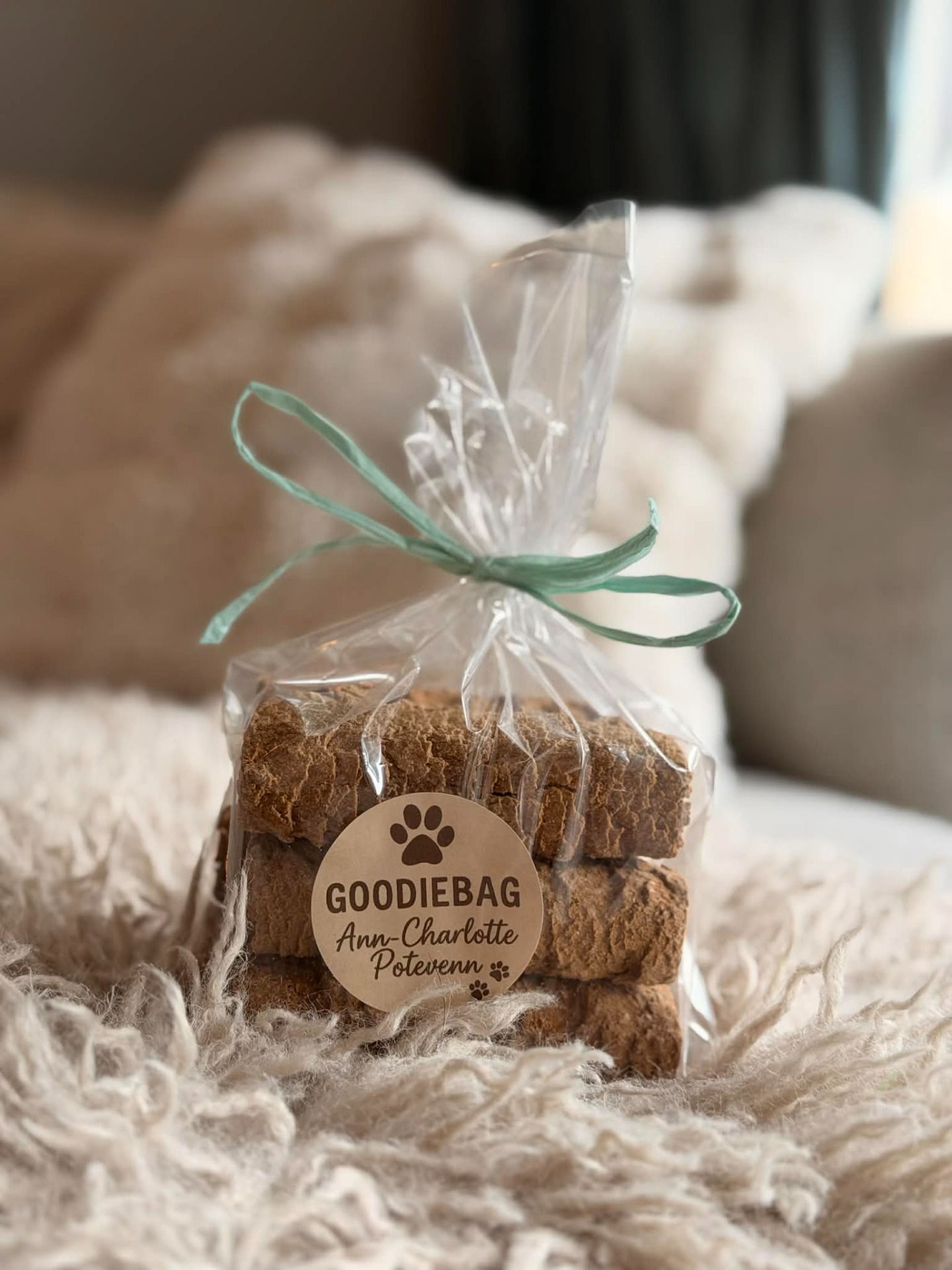 Hos Potevenn pakkes kjeksene i gaveposer – klare til å tas med hjem til en lykkelig hund.