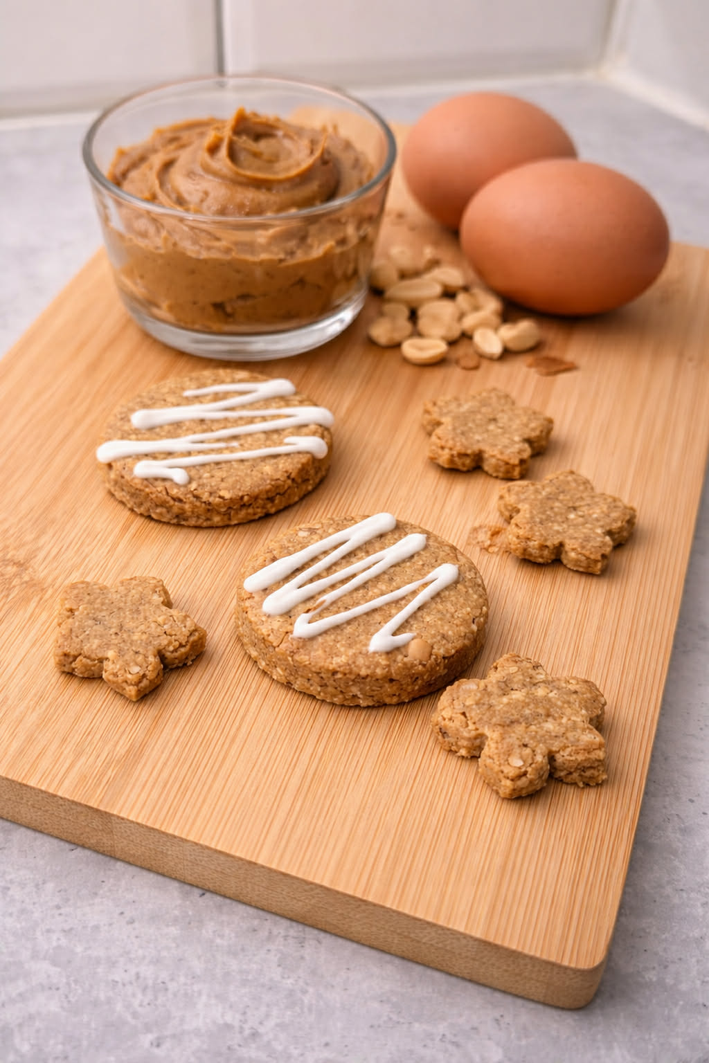 De er håndlaget med mildt, hundevennlig peanøttsmør uten salt og bakt til en sprø konsistens som gir god tyggemotstand og masse smak.
