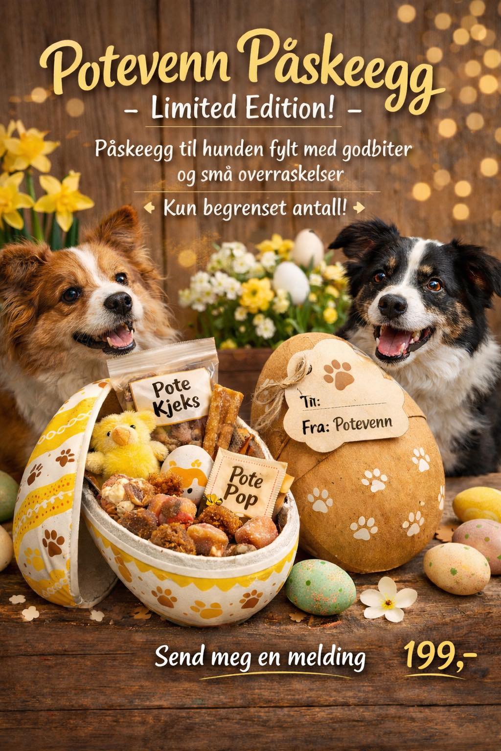 Jeg har laget et lite antall Potevenn Påskeegg, fylt med deilige godsaker og små overraskelser til din firbeinte venn. Perfekt som en liten påskegave.