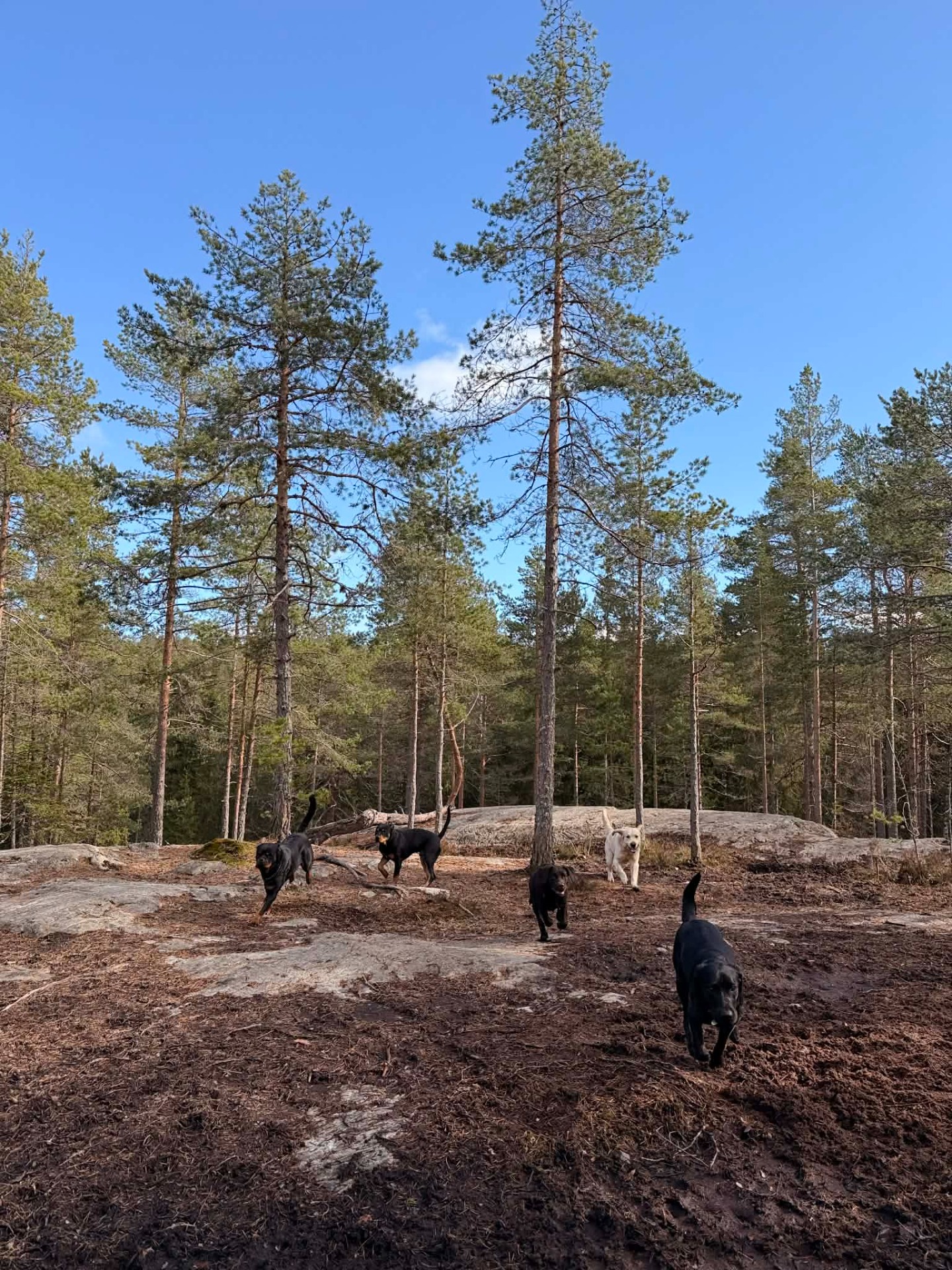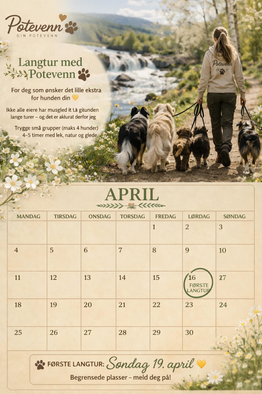 1–2 ganger i måneden tar jeg med en liten gruppe på maks fire hunder ut på langtur i skog og mark, i cirka 4–5 timer. Jeg henter og leverer hunden hjemme hos deg, så du slipper stress og logistikk, og du kan nyte en rolig dag med god samvittighet.